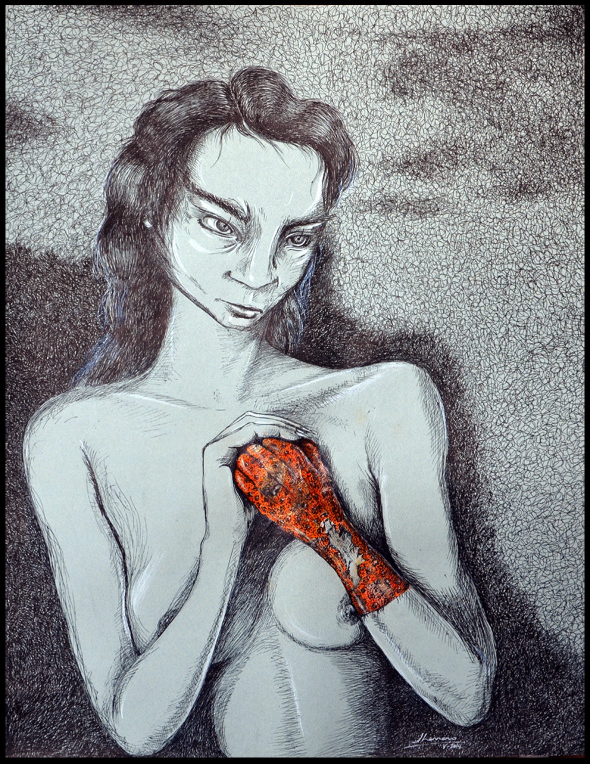 | Obra de Javier Herrero. Felina oscuridad. Dibujo con técnica mixta. |